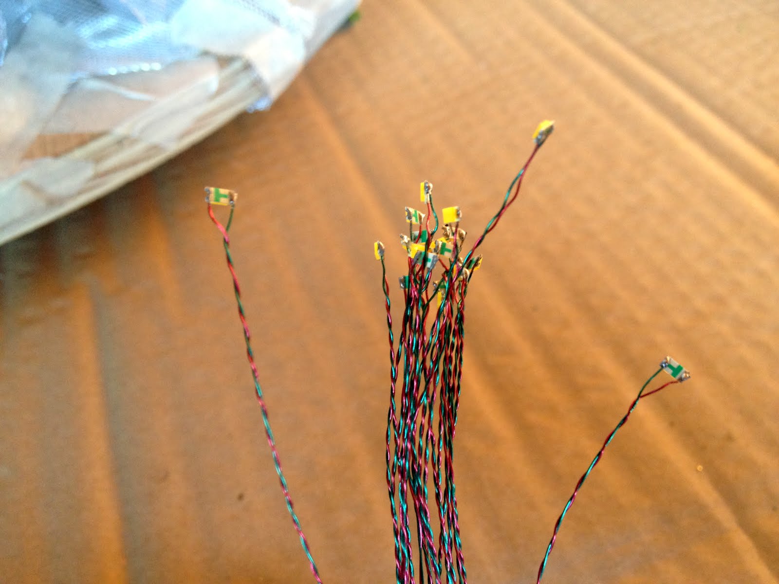 это да, просто когда у меня был один этот желтенький припаянный, как раньше я показывала, он светил чуть ярче, он изначально очень слабо светил, продавец показывал на своем "приборчике", просто когда он был сам по себе, то светил гораздо ярче, но переделывать уже не буду, я ж уже все замотала, даже если он и не светит почти, не страшно, задекорирую потом его