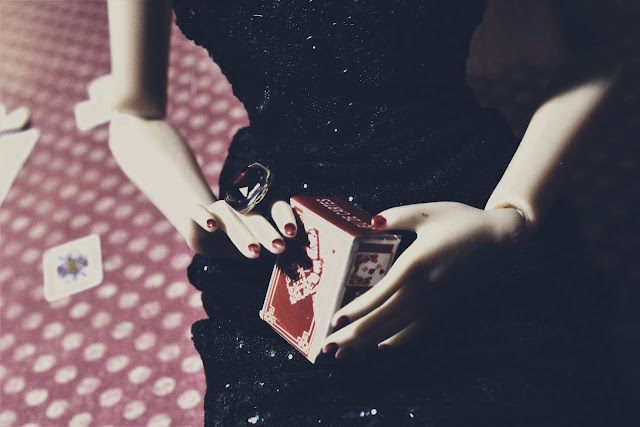 Баронесса: загадочна и мистична. Прекрасна одним словом, и чёрный ей к лицу. Карты... Эх, на куклофото и сами куклы и все эти их штучки-вещички кажутся 1/1, а в реале - малюууусенькое всё такое - даже не верится. И Баронессу я помню - летом она была такая... строгая но солнечная, а тут... Леди Ночь.)))