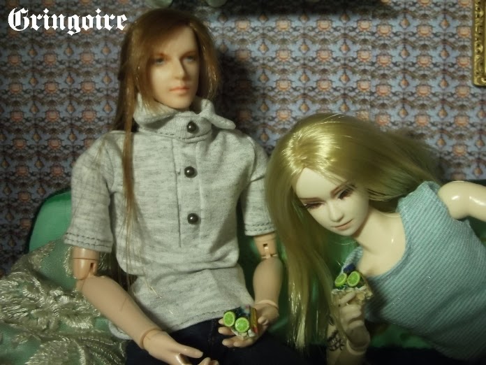 В их появлении меня радовало совершенно все. От того, что пришли они прямо-таки неожиданно быстро. И добротная упаковка: двойная почтовая коробка скрывала толстую коричневую. А только внутри нее великолепная подарочная коробка с семейной парой. Сами куклы тоже потрясающего качества – ровный мейк, интересный, словно бы бархатистый пластик. Понравился и тон кожи – очень естественный и живой. Мужчина оказался очень высоким – выше всех в моем кукольном царстве, его рост превышает 30 см. Поппи – отдельная песня… она смотрит на мир с таким презрительным лицом, словно говоря каждому мужчине «А, - бывший муж». Тут же и стало ясно что история у этой пары никак не может быть простой. Тогда мы с Лили взяли их в руки, в поле зрения были и другие куклы… и… сочинили вместе их Историю.